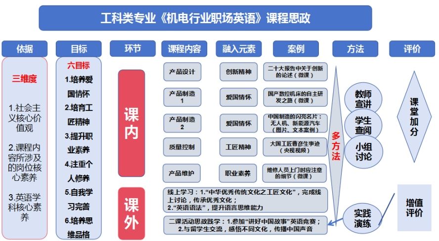 六目标,即通过课程思政,达到培养爱国情怀、培育工匠精神、提升职业素养、注重个人修养、自主学习完善、培养思维品格的六个目标,其中前四个目标既体现了机电类专业的特点,又体现了爱国、敬业、诚信、友善的社会主义核心价值观。后两个目标“自主学习完善、培养思维品格”为英语学科核心素养的要求。